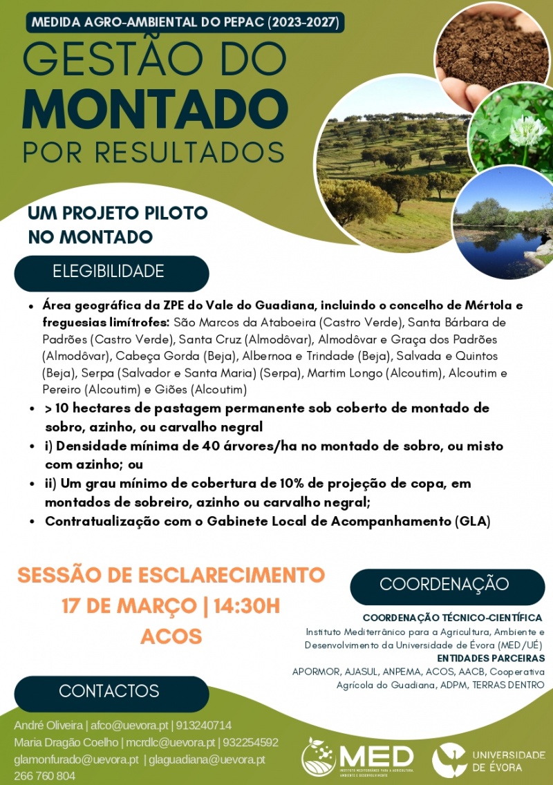 Esta sessão será dirigida pelo MED - Instituto Mediterrâneo para a Agricultura, Ambiente e Desenvolvimento da Universidade de Évora, que assume a Coordenação Técnico-Científica da medida.